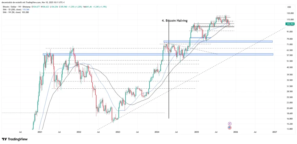 Bitcoin ist seit Anfang Oktober charttechnisch extrem unter Druck geraten. Der Kurs ist seit dem letzten Alltimehigh bis zum bisherigen Tief von knapp unter 100.000 Dollar um über 20 Prozent eingebrochen. Sowohl der 200-Tage-Trend als auch das Bullmarket-Supportband wurden als wichtige Unterstützungen gebrochen.
