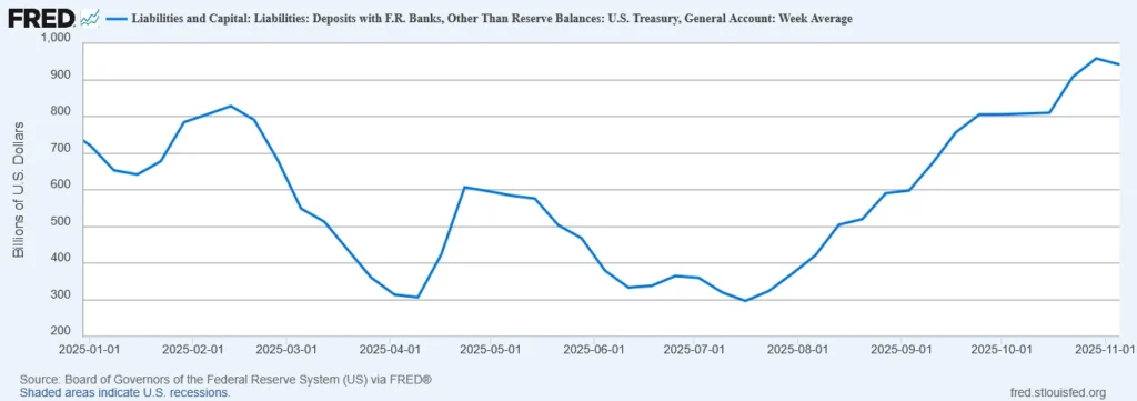 Der eigentliche Grund für den aktuellen Gegenwind dürfte aber einmal mehr in dem Haupt-Antriebsfaktor für Bitcoin liegen: der Liquiditätsentwicklung. Diese hängt aktuell unmittelbar mit dem US-Shutdown zusammen. Wenn Teile der US-Bundesregierung geschlossen sind, reduziert sich kurzfristig die Aus- bzw. Eingangs-Liquidität im System. Das US-Finanzministerium nimmt weiterhin Schulden auf und parkt dieses Kapital aktuell vermehrt im Treasury General Account bei der Fed. Mittlerweile liegen knapp eine Billionen Dollar im TGA.